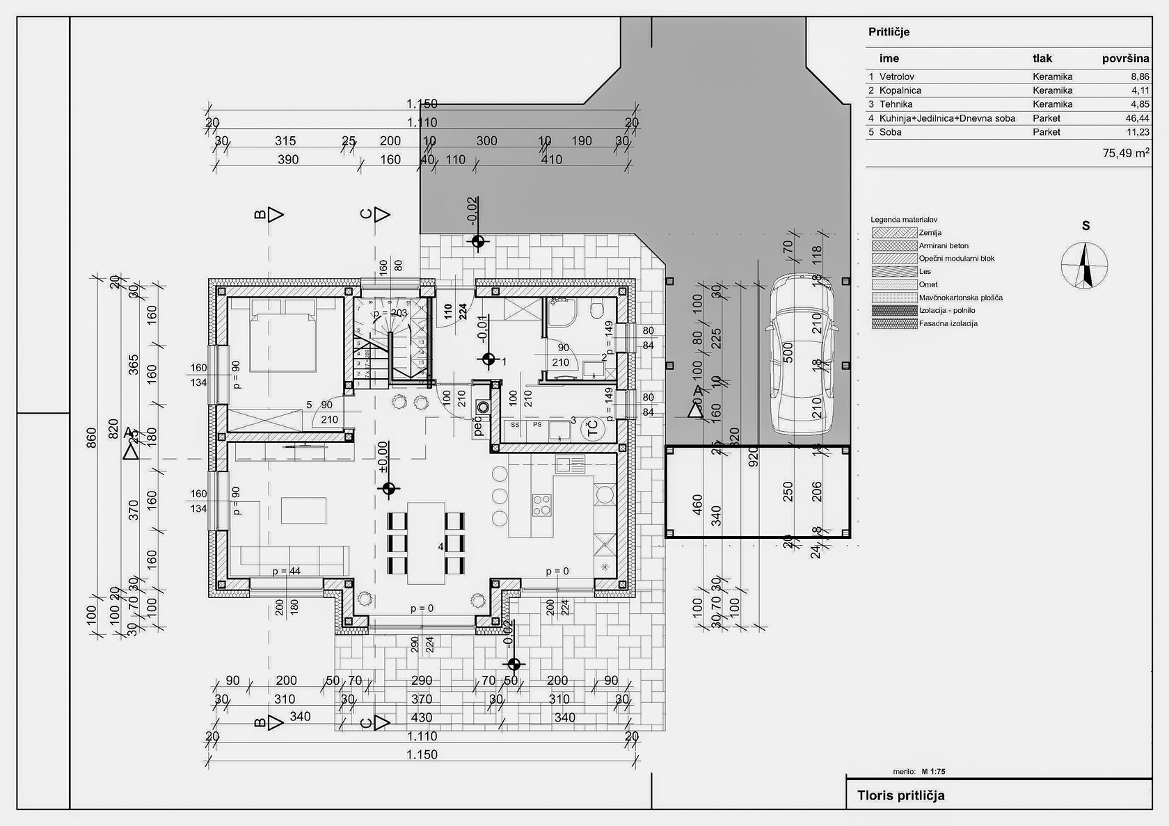 The design includes heat pump heating, ventilation system, fireplace installation option, and connection to a small wastewater treatment plant (MKČN).